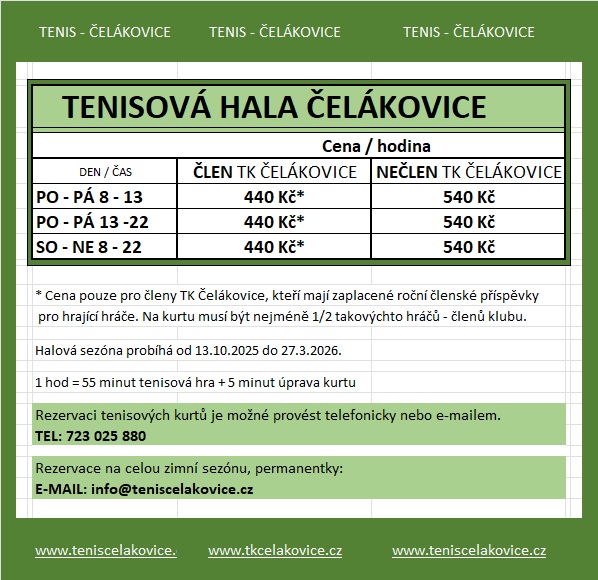Tenisový Klub Čelákovice Vám nabízí příjemný sportovní areál v klidném prostředí v blízkosti Labe. K dispozici Vám je 6 antukových dvorců na tenis, kurty na volejbal a beachvolejbal, klubovna se sociálním zařízením a občerstvením. TK Čelákovice je autem snadno dostupný z Prahy (cca 30 minut) s možností parkovat přímo v areálu.